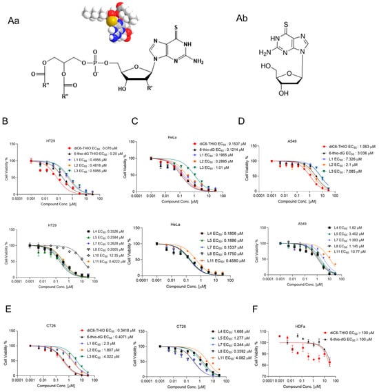 Biologic activity of phosphatidyl nucleoside conjugates in different human and murine cancer cell lines. General chemical structure of nucleoside phosphatidyl diglycerides, where R′ = H, and R″ = C3–C17 fatty acid residues; for diC6-THIOmolecule, R′ = H, R″ = C5 (Aa). Chemical structures of 6-thio-dG (Ab). Cell viability of human colorectal HT29 (B), human cervical HeLa (C), human NSCLC A549 (D), murine colorectal CT26 (E) cancer cell lines, and human dermal fibroblast HDFa cells (F) treated with the indicated concentrations of compounds for 4 days. Cell viability was measured using the MTT Assay. Samples were analyzed in triplicate, and EC50 values were calculated using GraphPad Prism.
