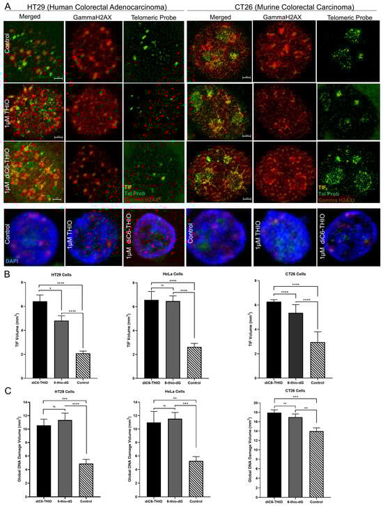 Telomere Dysfunction Induced Foci (TIF) Assay: HT29, HeLa, and CT26 cells were seeded into poly-lysine (Sigma, St. Louis, MO, USA)-coated wells. The cells were treated with 1 µM 6-thio-dG and 1 µM diC6-THIO for 96 h. The glass coverslips were washed with pre-extraction buffer (20 millimolar (mM) Tris-HCl, pH: 8, BioShop, Burlington, ON, Canada; 50 mM NaCl and 3 mM MgCl2, Sigma, Hamburg, Germany; 0.5% Triton X-100, BioShop, Canada; and 300 mM sucrose, Merck, Darmstadt, Germany) and fixed in a solution containing 4% formaldehyde (Thermo Fisher, Waltham, MA, USA). Then, the cells were permeabilized in a 0.5% solution of PBST (Triton X-100, BioShop Canada) and blocked with a 5% bovine serum albumin (BSA, Pessin, Germany) solution. The cells were incubated with the primary antibody (1:500, gammaH2AX, Cell Signaling, Danvers, MA, USA) and washed with 0.1% PBST. Subsequently, the cells were incubated with AlexaFluor 568 conjugated goat anti-mouse antibody (Invitrogen, Waltham, MA, USA) at a dilution of 1:1000 and fixed by 4% formaldehyde in PBS (Sigma, St. Louis, MO, USA) at room temperature. The slides were dehydrated with ethanol (Sigma, Hamburg, Germany) solutions of 70%, 90%, and 100%, and the slides were denaturated with hybridization buffer containing a peptide nucleic acid (PNA, Eurogentec, Seraing, Belgium) conjugated with fluorescein amidite (FAM). The samples were heated at 85 °C on a heat block for 4 min, washed with a washing solution (1M Tris HCl, pH: 7.5, 50% formamide; Sigma, Germany, 10% BSA), and mounted using Vectashield mounting medium with DAPI (Vector Laboratories, Newark, CA, USA).