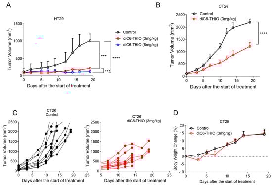 diC6-THIO reduces tumor growth in xenograft and syngeneic mouse models. Xenograft model with HT29 cells. The mice were subjected to 3 mg/kg diC6-THIO treatment (total of 6 doses on days 0, 2, 4, 6, 8, and 10, with day 0 designated as the day of treatment start) and 6 mg/kg diC6-THIO treatment (total of 4 doses on days 0, 2, 4, and 6, with day 0 designated as the day of treatment start). Tumor volumes were scored by GraphPad Prism (n = 2 per each group for nude CD1 mice, 2 × 106 HT29 cells were injected). *** p = 0.0003 (control vs. 3 mg/kg diC6-THIO), **** p < 0.0001 (control vs. 6 mg/kg diC6-THIO), and *** p = 0.0008 (3 mg/kg diC6-THIO vs. 6 mg/kg) in two-way ANOVA, (control; untreated) (A). The BALB/c mice tumor volume measurements. 2 × 106 murine CT26 cells were injected. BALB/c mice bearing CT26 tumors were treated with diC6-THIO (3 mg/kg, days 0, 2, 7, and 9, with day 0 designated as the day of treatment start). Data are shown as means ± SEM from two independent experiments. p-value was determined by two-way ANOVA by using GraphPad Prism. (n = 10 per each group, **** p < 0.0001 control vs. diC6-THIO in two-way ANOVA, control; untreated) (B). Individual tumor growth of control and diC6-THIO treatment groups (C). Graph shows body weight changes of mice in percentage following diC6-THIO treatment. The weights were measured every 2 days (D).