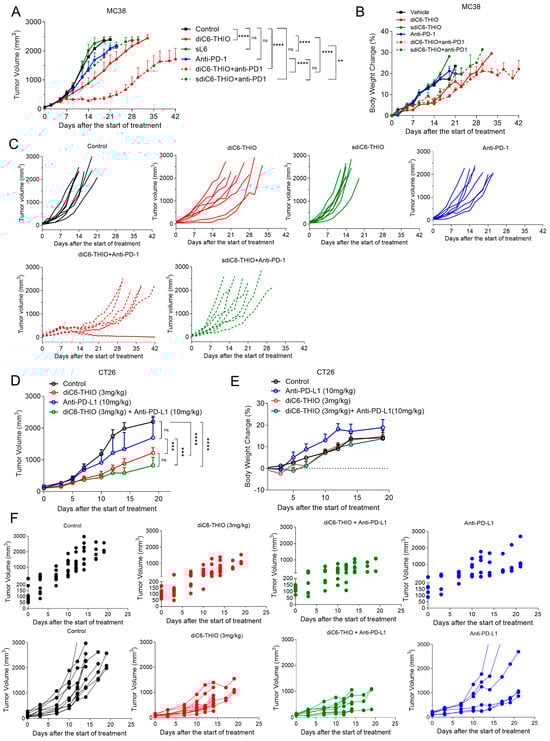 Therapeutic efficacy of diC6-THIO when sequentially combined with anti-PD-1 and anti-PD-L1 in MC38 and CT26 colon cancer models. Data are shown as means ± SEM. p-value was determined by two-way ANOVA by using GraphPad Prism. In MC38 mouse model treatment groups, the mice were administered with 6 mg/kg diC6-THIO (i.v.) or 6 mg/kg sdiC6-THIO (i.v.) on days 0, 1, 2, 7, 8, and 9 and/or 10 mg/kg anti-PD-1 (i.p.) on days 4 and 12 (n = 8 per group). There were statistically significant differences between control vs. diC6-THIO (**** p < 0.0001), control vs. diC6-THIO + anti-PD-1 (**** p < 0.0001), diC6-THIO + anti-PD-1 vs. anti-PD-1 (**** p < 0.0001), control vs. diC6-THIO + anti-PD-1 (**** p < 0.0001), anti-PD-1 vs. DIC6-THIO + anti-PD-1 (**** p < 0.0001), diC6-THIO vs. diC6-THIO + anti-PD-1 (**** p < 0.0001), sdiC6-THIO vs. sdiC6-THIO + anti-PD-1 (** p = 0.0013), and diC6-THIO vs. sdiC6-THIO (**** p < 0.0001). No significant differences (ns) were found between control vs. sdiC6-THIO (p = 0.9301), control vs. anti-PD-1 (p = 0.1357), control vs. sdiC6-THIO + anti-PD-1 (p = 0.0756), and anti-PD-1 vs. sdiC6-THIO + anti-PD-1 (p = 0.9995). For statistical calculations, the final measurements from the euthanized mice are included until the completion of each group, which is determined by the endpoint reached when all mice in that group die. When comparing two groups, the statistical calculations consider the endpoint of the earlier group as reference (A). The body weight changes in percentage from MC38 control, diC6-THIO, sdiC6-THIO, diC6-THIO+ anti-PD-1, sdiC6-THIO + anti-PD-1, and anti-PD-1 groups (B). Individual MC38 tumor growth curves from control and treatment groups (C). In the CT26 mouse model, the mice were administered with 3 mg/kg diC6-THIO (i.p.) on days 0, 2, 7, 9 and/or 10 mg/kg anti-PD-L1 (i.p.) on days 4, 11. there was statistically significant difference between control vs. diC6-THIO (**** p < 0.0001), control vs. diC6-THIO + anti-PD-L1 (**** p < 0.0001), diC6-THIO vs. anti-PD-L1 (*** p = 0.0009), and diC6-THIO + anti-PD-L1 vs. anti-PD-L1 (*** p = 0.0003). No significant differences were found between diC6-THIO vs. diC6-THIO + anti-PD-L1 (p = 0.3222) and control vs. anti-PD-L1 (p = 0.4222). For statistical purposes only, the final measurements from the euthanized mice were included up to the completion of each group, which occurred on day 19 (D). The body weight changes of mice in percentage from CT26 control, diC6-THIO, diC6-THIO + anti-PD-L1, and anti-PD-L1 groups (E). Individual CT26 tumor growth curves from control and treatment groups (F).
