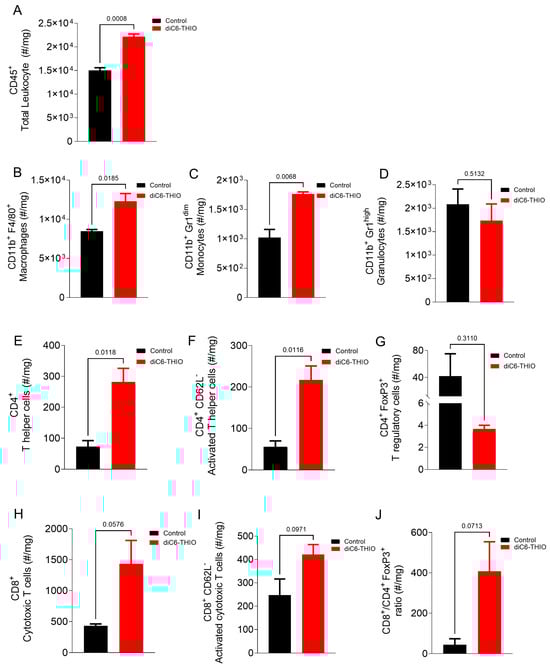 We conducted flow cytometry to characterize immune cell populations within the tumor microenvironment. The initial analysis of immune cell percentages revealed no significant differences in the proportion of infiltrating immune cells in the diC6-THIO-treated group compared to the control group (Table 2, Supplementary Figure S3A–F). However, percentage-based comparisons alone may not fully capture changes in immune cell infiltration, particularly given the differences in tumor sizes between the groups. While the percentages provide valuable insights into the relative distribution of immune cell subsets, they do not account for absolute changes in cell infiltration per milligram of tumor tissue. To address this limitation, we quantified immune cell infiltration as the number of cells per milligram of tumor tissue (Figure 5). This analysis revealed that diC6-THIO treatment led to an increase in the total leukocyte (CD45+ cells) counts within the tumor tissue (Figure 5A). Among myeloid populations, macrophages and monocytes showed increased infiltration (Figure 5B,C), whereas granulocyte numbers remained unchanged (Figure 5D). Similarly, lymphoid populations exhibited enhanced infiltration of T helper (CD4+) and cytotoxic T cells (CD8+), accompanied by an increase in number of activated lymphocytes in both subsets (Figure 5E,F,H,I). In contrast, T regulatory (Treg) cell counts were reduced (Figure 5G). Importantly, the CD8+ T cell to Treg (#/mg CD8+/Treg) of (CD4+ FoxP3+) ratio increased following diC6-THIO treatment (Figure 5J). Although these findings suggest enhanced immune activation, the reductions in Tregs, increases in activated CD8+ T cells, and the elevated CD8+/Treg ratio did not reach statistical significance.