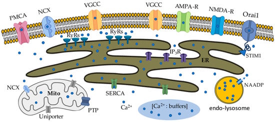 In the majority of CNS neurons, changes in free intracellular calcium concentration ([Ca2+]i) occur due to the activation of voltage-gated calcium channels (VGCCs) or ligand-gated channels, including neuronal glutamate receptors [,,]. Calcium is subsequently buffered by calcium-binding proteins, including calmodulin, calreticulin, parvalbumin, and calbindin-D28k. The ER membrane also contributes to the propagation of calcium-based signals, primarily along the dendritic length and soma, moving from the periphery to the center of the cell. Similar to the attenuation of electrical potentials, the flux of calcium through ER receptors results in the passive diffusion of calcium to nearby sites [,,]. Inositol 1,4,5-trisphosphate receptors (IP3Rs) and ryanodine receptors (RyRs) are located in the ER and generate Ca2+ signals in response to neuronal activity. The ER extends throughout the neuronal structure, allowing intracellular Ca2+ release in dendrites, somatic regions, and presynaptic boutons []. The major channels and receptors involved in Ca2+ signaling in neurons are shown in Figure 1.