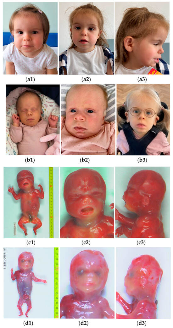 Proband 2 (P2) was the second-born child of healthy Danish parents, with a healthy older brother and later a healthy younger brother. Her mother had well-managed hypothyroidism throughout the otherwise uneventful pregnancy. The patient was born at 37 + 5 wgs. Birth weight was 4040 g. At birth, she was able to breastfeed. Due to persistent jaundice and lethargy, she was treated with phototherapy at the maternity ward. At four days old, she was examined by a pediatrician due to folds on both ears. Having dismissed the suspicion of a syndrome, the family was advised to consult an ear, nose and throat- specialist. The facial appearance developed gradually after birth (Figure 1(b1–b3)). At five months, the suspicion of a syndrome was raised again due to delayed motor development and distinctive facial appearance: she was slightly dysmorphic, with dolichocephaly, hypotelorism, large ears, a flat nasal bridge, and thin feathery hair. She also exceeded height and weight curves by more than three standard deviations. At six months, an abdominal US revealed bilateral hydronephrosis, which was treated with prophylactic antibiotics. Concomitantly, she was hospitalized several times a month due to frequent respiratory infections. By 10 months, she could roll back to front and grasp objects with her hands, but she still had limited head control. However, epileptic spasms began at 10 months, leading to developmental regression. The initial seizures were characterized by a distant gaze and cyanosis around the lips, accompanied by a series of flexions in the trunk and upper extremities, lasting for 2–3 s each, occurring consecutively, and associated with vomiting. The first EEG was described as hypsarrhythmic. She lost head control, the ability to roll, and the use of her hands. By age 3, she exhibited profound global developmental delay, with minimal abilities beyond briefly grasping objects. She had no eye contact, no speech, and experienced difficulties swallowing. Her seizures were challenging to manage; we tried several anti-epileptic drugs, prompting the initiation of a ketogenic diet.