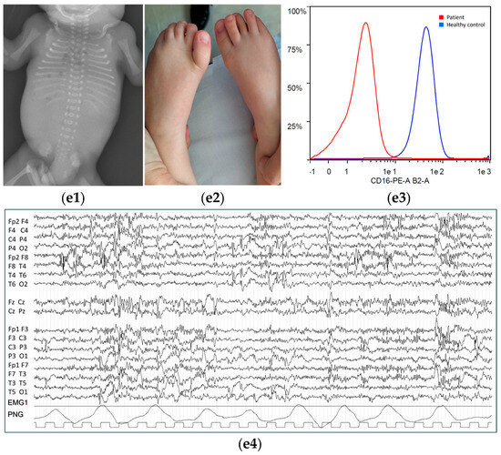 The proband 1 (P1) was a 4-year-old girl, second-born of a healthy, non-consanguineous couple from northern Italy, who had one previously unexplained miscarriage and a healthy boy. The girl’s family history was unremarkable. After a spontaneous conception, an increased risk for trisomy 21 (1/94) resulted in a combined first-trimester screening test. We detected an overriding aorta at the second-trimester ultrasound (US) at 20 weeks of gestation (wgs). After genetic consultation, we performed amniocentesis with non-conclusive karyotype, FISH investigation for 22q11.2 deletion, and genomic microarray. The second-level US followed the pregnancy for cardiac defect without the detection of other anomalies. The baby was spontaneously delivered at 37 + 6 wgs. Birth weight was 2700 g (90 percentile, pct). APGAR was 9/9. Newborn screenings (hearing and metabolic) were normal. At birth, an echocardiogram confirmed a complex cardiac malformation type tetralogy of Fallot, with ventricular septal defect, without obstruction but with altered pressures in the pulmonary artery, and with an atrial septal defect, ostium secundum type. The patient underwent medical treatment with furosemide until the surgical correction at two months of life. Subsequently, she presented global developmental delay. Genetic evaluation at 21 months of life disclosed peculiar facial features: squared face with a broad forehead, depressed nasal root with a short nose, thin upper lip, occasional mild protruding tongue, and diastema. Growth parameters (height: 83 cm (52 pct), weight 10 kg (15 pct), head circumference 47.7 cm (70 pct)) were average. Neuropsychiatric and neuropsychologic evaluations confirmed a global developmental delay with gross motor difficulties and verbal language delay. Clinical re-evaluations at 38 (Figure 1(a1)) and 45 months of age (Figure 1(a2)) described more evident facial dysmorphisms, including a coarse face with a prominent forehead, depressed nasal root, marked philtrum, and widened mouth with thin upper lip. In the profile view, we also observed anteverted, slightly low-set ears, a short nose, a protruding philtrum, and micrognathia (Figure 1(a3)). There were no hand anomalies, but the left toe was low-set, and the subject presented overcrowding of the toe (Figure 1(e2)). We also noted a unilateral inguinal hernia. Neurologic re-evaluation confirmed a global developmental delay, with absent speech, limited comprehension, and immature gross and fine motor skills. The objective neurologic examination revealed that the patient had low muscle mass but normal strength. No clinically recognizable epileptic episodes were reported. We noted behavior abnormalities with poor gaze engagement, limited pointing, and deficit attention. EEG during sleep proved: (a) the absence of typical elements of physiological organization that differentiate phases of drowsiness/sleepiness from phases of deeper sleep; (b) the presence of diffuse rapid activity that increases in amplitude and becomes dominant as sleep onset progresses; and (c) the presence of multifocal paroxysmal abnormalities (Figure 1(e4)). Given the absence of clinically recognizable epilepsy and limited patient collaboration, the EEG was recorded during sleep only at follow-up. Surgical treatment for correction of the right inguinal hernia was performed before the age of four. Odontostomatological evaluation revealed tooth agenesis and maxillofacial CT confirmed the inclusion of elements 82–83 and the absence of elements 35 and 45. Biochemical investigations pointed out hypophosphatasia with increased plasma values of ALP (519 U/L) at 45 months of age. Flow cytometry documented a near-absent expression of CD16 on the patient’s neutrophils (Figure 1(e3)). Comprehensively, immunophenotyping showed a GPI-anchored protein deficiency. Brain MRI, abdominal US, ophthalmological, ear, nose and throat and audiological evaluations were unremarkable. Personalized follow-up is ongoing at the referral pediatric center for rare diseases.