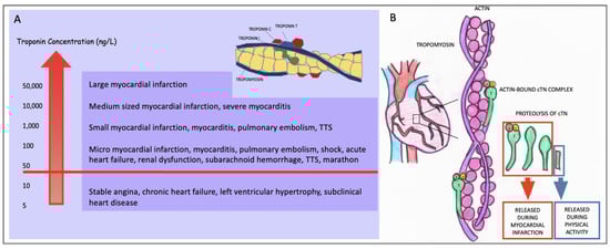 Cardiac troponin is a complex molecular structure. It is a heterotrimer anchored on the thin filament that operates allosterically to control the intracellular Ca2+-dependent interaction of actin and myosin filaments. Different cardiac, ischemic and non-ischemic, and non-cardiac conditions contribute differently to cardiac troponin elevation (Figure 1A). However, troponin structure is more complex than it was previously thought. Since many studies have shown the existence of several circulating cTnI and cTnT forms in the blood, it was demonstrated that different cTn forms could help to distinguish acute myocardial infarction from other illnesses. Moreover, cTnI and cTnT, if related to an MI, are primarily found in a binary complex or as fragments, as described lately in [] with larger or smaller sizes, while, after physical activity, smaller fragments (15–20 kDa) can be isolated, as demonstrated in Figure 1B.