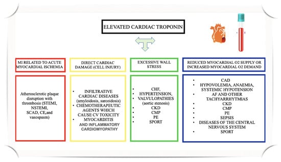 As previously mentioned, among ostensibly healthy individuals, athletes constitute a unique subgroup. Strenuous physical exercise can elevate cTn levels, and recent studies have challenged the assumption that this increase is benign in athletes, suggesting that it may have both clinical and prognostic significance in certain contexts []. Nonetheless, cTn elevation can also occur in a variety of acute and chronic conditions, as illustrated in Figure 2.