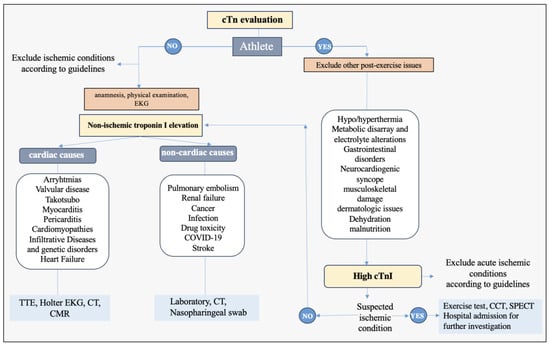 Given these ongoing uncertainties, athletes experiencing exercise-induced cTn elevations should undergo a comprehensive diagnostic evaluation (Figure 3). Although endurance athletes generally have a low risk of atherosclerotic CAD, there remains a minor but significant risk that can be underestimated []. Athletes presenting to the emergency department with elevated cTn post-exercise should receive appropriate evaluation, including assessment to exclude non-cardiac conditions, a 12-lead ECG, serial cTn measurements, and noninvasive or invasive risk stratification based on the clinical context [].