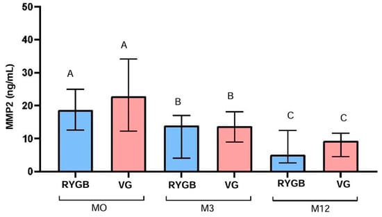 In the RYGB group, MMP-2 levels decreased significantly over time (p < 0.0001), from a median of 17.7 ng/mL at M0 to 14.2 ng/mL at M3 and 5.1 ng/mL at M12. This represents a 71.2% reduction in MMP-2 levels after 12 months. Similarly, in the VG group, there was a significant reduction in MMP-2 levels over time (p < 0.0001), from a median of 22.9 ng/mL at M0 to 13.8 ng/mL at M3 and 9.5 ng/mL at M12, representing a 58.5% reduction in MMP-2 levels after 12 months (Figure 2).