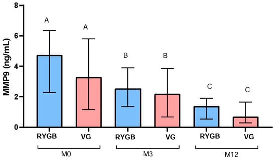 MMP-9 levels also decreased significantly in the RYGB group over time (p < 0.0001), from a median of 4.7 ng/mL at M0 to 2.5 ng/mL at M3 and 1.4 ng/mL at M12, resulting in a 70.2% reduction after 12 months. In the VG group, MMP-9 levels decreased significantly as well (p < 0.0001), from a median of 3.3 ng/mL at M0 to 2.2 ng/mL at M3 and 0.7 ng/mL at M12, representing a 78.8% reduction after 12 months (Figure 3).