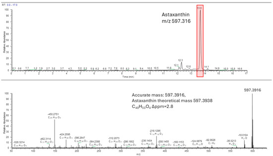 Analysis through HPLC-HRMS confirmed the presence of astaxanthin in the ethanolic extract of Procambarus clarkii. The chromatogram displayed a peak with a retention time of 13.6 min, which can reasonably be attributed to astaxanthin-like structures, such as geometrical isomers, based on the observed m/z value in the high-resolution mass spectra (Δppm = −2.8) and the corresponding MS/MS spectrum.