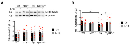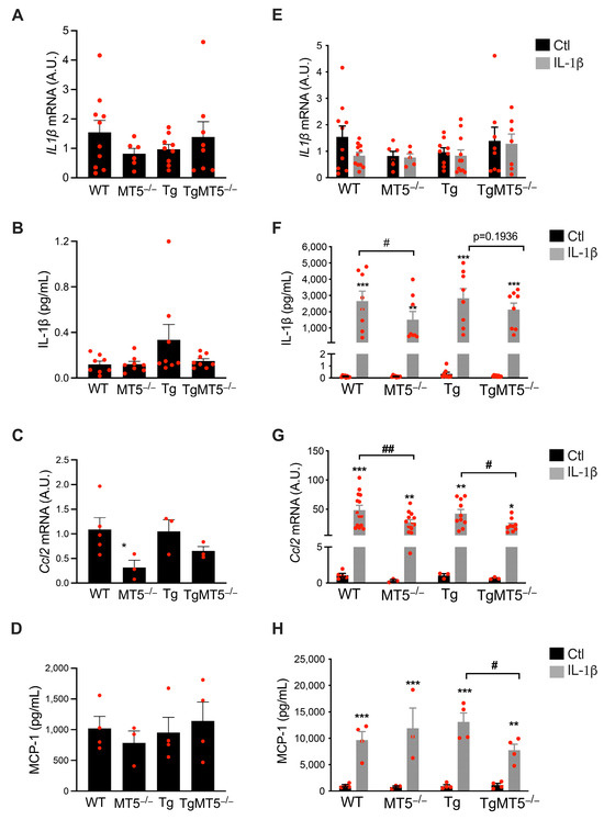 | WT (n = 7–10) | WT IL-1β (n = 3–15) | MT5−/− (n = 6–15) | MT5−/− IL-1β (n = 5) | Tg (n = 5–10) | Tg IL-1β (n = 5) | TgMT5−/− (n = 6–10) | TgMT5−/− IL-1β (n = 5) | ||