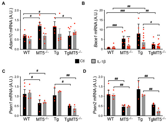 3.9. MT5-MMP Deficiency and IL-1β Treatment Modulate the Expression of Genes Involved in APP/Aβ Metabolism