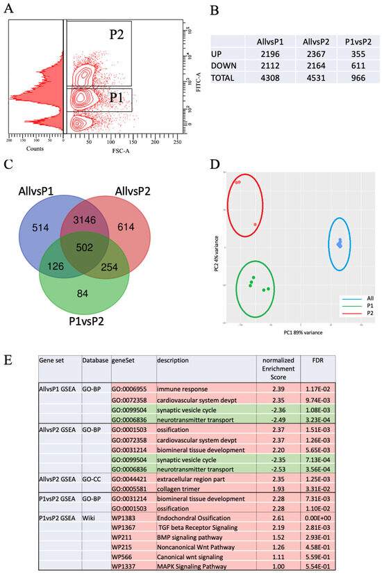 Analysis of the Differentially Expressed Genes (DEGs) (p < 0.001, log(fold-change) > 1.6) lists revealed, respectively, 4308 DEGs in P1 and 4531 DEGs in P2 relative to the “All” population (“AllvsP1” and “AllvsP2”), but only 966 DEGs were observed between P1 and P2 subpopulations (“P1vsP2”) (Figure 1B and Table S1). A Venn diagram analysis showed that a vast majority of genes (3648) were common to the “AllvsP1” and “AllvsP2” (Figure 1C), which also encompassed a majority of those differentially expressed in the subpopulations “P1vsP2”. Principal Component Analysis revealed that the two subpopulations P1 and P2 were very distinct from the general “All” cell population (PC1; 89% of the variance); however, the P1 and P2 cells clearly clustered separately (PC2; 4% of the variance), indicating that they may be distinct subpopulations of osteoblasts (Figure 1D). We then analyzed the different DEG lists for enrichment in various databases (GO terms, KEGG, Panther, Reactome, and Wikipathways) to identify biological functions, cellular components, or pathways that may be affected. GSEA analysis revealed that, relative to “All”, in the P1 population (“AllvsP1”) immune response and cardiovascular development were the top biological processes that were up-regulated, while in the P2 subpopulation (“AllvsP2”), ossification and biomineral tissue development were significantly induced (Figure 1E and Table S2). Also, “extracellular region part” and “collagen trimer” were identified as the major cellular components.