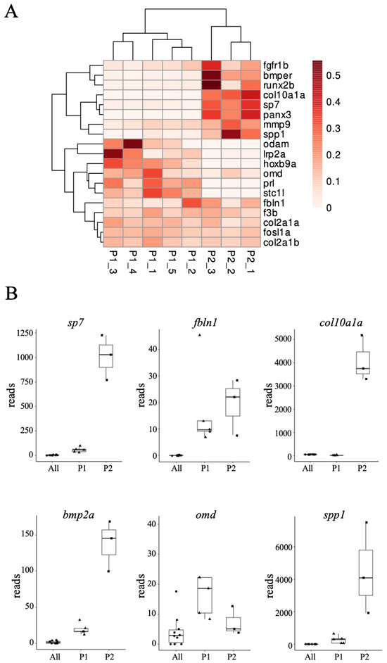 Different patterns emerged for individual genes when looking at their changes in expression in the different cell populations, as illustrated for selected genes displayed in a clustered heat map based on the change in the number of reads relative to the “All” population (Figure 2A). Genes unaffected or slightly upregulated in P1, but strongly upregulated in P2 would be known osteoblast markers such as sp7 (and the transgene GFP, as expected from the FACS sorting method), but also bmp2a, col10a1a, panx3, and spp1 (Figure 2B). Others were increased in P1, and remained high in P2 (fbln1, col1a1, col2a2a, col2a2b). The last group of genes show increased expression in P1 relative to “All”, and a decrease in P2 (lrp2a, omd, stcl1). These observations indicate the involvement of a complex pattern of gene regulations comparing the general larvae cell population “All” to the P1 and P2 subpopulations.