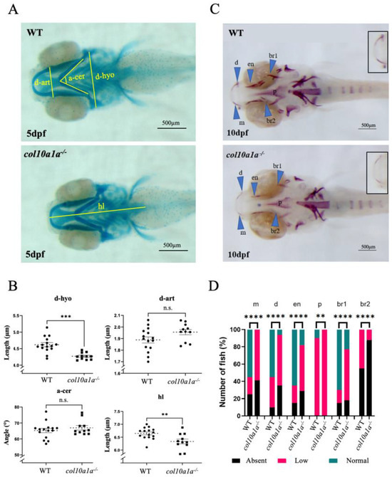 col10a1a−/− mutants display a small chondrocranium at 5 dpf and decreased mineralization at 10 dpf compared to wt controls. (A) Ventral view of alcian blue stained WT and col10a1a−/− larvae at 5 dpf. The distances measured are indicated as described in Mat. and Meth. (B) col10a1a−/− reveal reduced head size at 5 dpf compared to WT (p < 0.01; WT n = 12, col10a1a−/− n = 15). Measures are distances from anterior to the posterior end of the ethmoid plate (head length-hl), between the two hyosymplectics (d-hyo), between the articulations joining the Meckel’s cartilage to the palatoquadrate (d-art), and the angle formed by the two ceratohyals (a-cer). (C) Ventral view of alizarin red stained WT and col10a1a−/− larvae at 10 dpf. The blue arrowheads point to the skeletal elements: maxillary (m), dentary (d), parasphenoid (p), entopterygoid (en), branchiostegal rays 1 and 2 (br1/br2). Inserts show the maxillary and dentary. (D) Fraction (%) of individuals presenting a high (green), reduced (red), or absent (black) level of bone mineralization in the different bone elements in WT and col10a1a−/− fish at 10 dpf. (WT n = 20, col10a1a−/− n = 17). (n.s. = non significant) significance: ** p < 0.01, *** p < 0.001, and **** p < 0.0001.