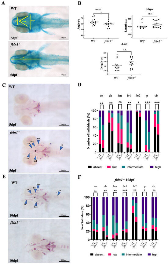 fbln1−/− mutants present increased mineralization at 5 dpf compared to WT. (A) Ventral view of alcian blue stained WT and fbln1−/− larvae at 5 dpf. The distances measured are indicated. (B) fbln1−/− reveal reduced angle between ceratohyals (a-cer) at 5 dpf compared to WT (WT n = 15, fbln1−/− n = 12). (C) Ventral view of alizarin red stained WT and fbln1−/− larvae at 5 dpf. The blue arrowheads point to the skeletal elements: ceratohyal (ch), parasphenoid (p), entopterygoid (en), branchiostegal rays 1 and 2 (br1/br2), hyomandibular (hm), and vertebral body (vb). (D) Fraction (%) of individuals presenting a high (dark blue), intermediate (green), low (red), or absent (black) level of bone mineralization in the different bone elements in WT and fbln1−/− fish at 5 dpf. (WT n = 52, fbln1−/− n = 68). (E) Ventral view of alizarin red stained WT and fbln1−/− larvae at 10 dpf. (F) Fraction (%) of individuals presenting a high (dark blue), intermediate (green), low (red), or absent (black) level of bone mineralization in the different bone elements in WT and fbln1−/− fish at 10 dpf. (WT n = 35, fbln1−/− n = 40). (n.s. = non significant), significance: * p < 0.05, ** p < 0.01, and *** p < 0.001.