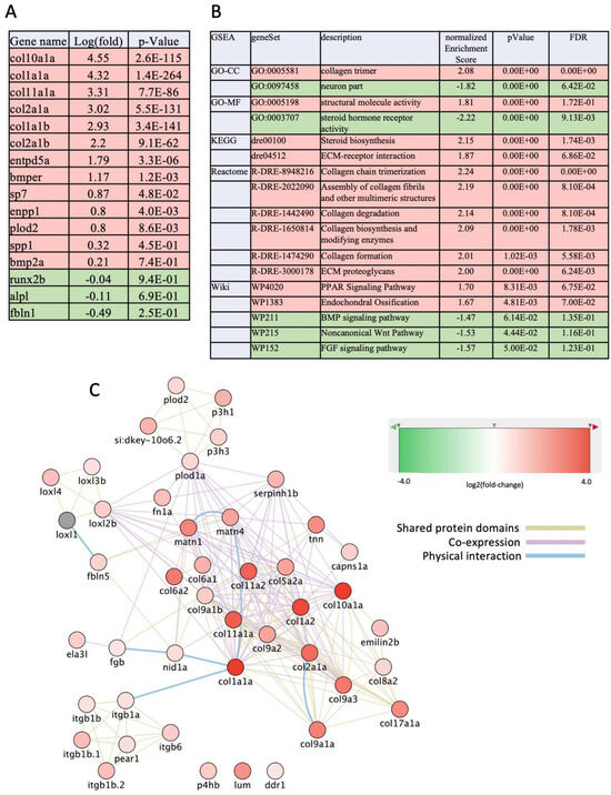 Changes of transcriptome in fbln1−/− mutants relative to WT at 10 dpf. (A) Log(fold-change) and p-values for some genes selected for their known role in osteogenesis. (B) Selected functional annotations of the list of DEGs in fbln1−/− mutants. (C) Network of DEGs centered around the genes involved in collagen biosynthesis. Red color refers to functions or genes that are upregulated, Green indicates genes or functions that are down-regulated in the mutants. In (C), the edges are color-coded according to the nature of interaction between nodes (genes) as indicated.