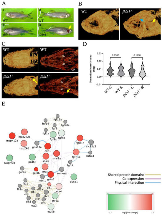 fbln1−/− mutant zebrafish show missing opercle on the right side. (A) Adult fbln1−/− fish bright field image showing the missing opercle (yellow arrow). (B) 3D Reconstructed images from µCT scans of adult WT control and fbln1−/− fish head (yellow arrow: missing opercle, blue arrow: thickened subopercular bone). (C) 10 dpf Alizarin red stained zebrafish in ventral view (yellow arrow: missing opercle). (D) Left (L) and Right (R) opercle area measured in ventral view on 10 dpf alizarin red stained WT control and fbln1−/− zebrafish larvae show the trend of asymmetry between the L and R opercles in fbln1−/− mutant zebrafish (n = 34 WT, n = 37 fbln1−/− mutants). (E) Differentially expressed genes in fbln1−/− mutants that are involved in Fgf and Mapk signaling.