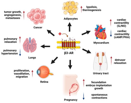 The contribution of β3-ARs in promoting embryo properties and functional roles in germ cells, in preimplantation embryos and in the first week of embryogenesis, suggested that the original function of β3-ARs could have been involved in the promotion of proliferation, vascularization, metabolic adaptation and immune tolerance [155]. Since β3-AR was expressed under hypoxia, it has been assumed a relationship between the hypoxic upregulation of β3-ARs, which promoted immune tolerance [156], and the initial mechanisms that were predicted to guarantee fetal tolerance. In the female reproductive system, such as the placenta, ovaries, and fallopian tubes, there was reported the expression of β3-AR mRNA and protein levels [157], but also in mammalian oocytes [158], where they induced motility [159]. In Chinese hamster ovary/K1 cells, it has been reported the β3-ARs expression [29]. Activation of β3-AR in the myometrium relaxed contractions [12], and its expression increased during gestation [160]. In myometrial microvascular endothelial cells, mirabegron stimulated the NO production and the uterine tissue relaxation, in vitro, was partially blocked by the addition of the eNOS synthase blocker [161].