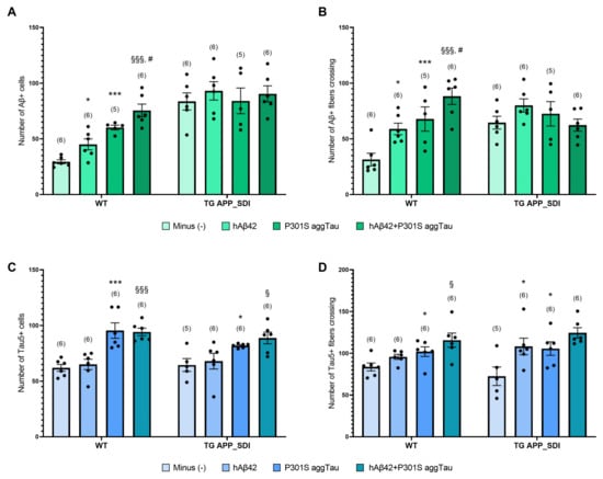 Figure 2. Spreading of human amyloid-beta (hAβ42) and P301S aggregated tau (aggTau) in postnatal wild-type and transgenic organotypic brain slices. Brain slices were prepared from postnatal day 8–10 wild-type (WT) C57BL6 mice or transgenic (TG) amyloid precursor protein _Swedish–Dutch–Iowa (APP_SDI) mice. Collagen hydrogels with hAβ42, P301S aggTau, or a mix of both was loaded after 1 week in culture. Collagen hydrogels with an empty load were included as negative controls. Slices were cultured for 8 weeks, fixed and analyzed by immunohistochemistry for Aβ using the antibody clone 6E10 or for tau using the antibodies Tau5 or AT8. Images were taken at the 20× magnification with a field size of 523 × 392 µm, which were quantified using ImageJ (Version 5.5.0). (A) Quantification of the number of Aβ+ cells in the ventral areas of WT and TG APP_SDI slices. (B) Quantification of the Aβ+ fiber density. (C) Quantification of the number of Tau5+ cells in the ventral areas of WT and TG APP_SDI slices. (D) Quantification of the Tau5+ fiber density. The corresponding fiber densities were calculated by counting the number of times fibers crossed a predefined grid on the same image used to analyze the number of Aβ+ or Tau5+ cells. Note that no mature Aβ plaques or tau neurofibrillary tangles were observed in these postnatal slices. Values are given as mean ± SEM for each group and the values in parentheses represent the number of analyzed animals. The dots represent individual raw data values. Statistical analyses were performed using a one-way ANOVA with a Fisher’s LSD post-hoc test. * p < 0.05, *** p < 0.001 signifies comparisons against the respective (−) groups. § p < 0.05, §§§ p < 0.001 signifies comparisons between hAβ42 + P301S aggTau and hAβ42 groups. # p < 0.05 signifies comparisons between hAβ42+ P301S aggTau and P301S aggTau groups.