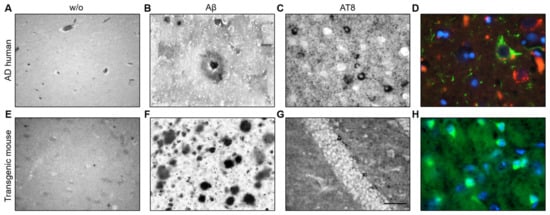 Figure 3. Characterization of amyloid-beta (Aβ) plaques and tau neurofibrillary tangles (NFT) in post-mortem human and transgenic mouse slices. Tissue sections from the temporal lobe of a human Alzheimer’s disease (AD) patient (AD) were probed for the appearance of Aβ plaques and tau NFT. Following the deparaffinization and antigen retrieval protocols, the slices were subject to immunohistochemistry. (A) The lack of a primary antibody (w/o) served as a negative control with background staining. (B) An Aβ plaque was detected by using the Aβ antibody clone 6E10 with a dense plaque core and the surrounding corona. (C) Tau containing NFTs were visualized in human tissue sections with a densely stained cytoplasm and unstained nuclei. (D) A representative image displayed the pyramid-shaped tau NFT (green; AlexaFluor-488), Aβ plaques (red; Thiazine Red dye) and nuclei (blue; DAPI). (E) Slices from transgenic (TG) amyloid precursor protein _Swedish–Dutch–Iowa (APP_SDI) mice (FH) exhibited no staining without a primary antibody (w/o). (F) Slices from TG APP_SDI mice displayed numerous Aβ plaque structures. (G) Slices from a TG mouse model expressing the human tau protein were commercially obtained and probed for tau NFTs, which could be detected with intracellular staining and unstained nuclei. (H) A representative image from the human tau-expressing TG mice showed strong staining in neuronal cells detected by AT8 antibody (green; AlexaFluor-488) with nuclear staining (blue; DAPI). Scale bar in G = 50 µm in (AC); 27 µm in (D); 100 µm in (EG); 27 µm in (H).