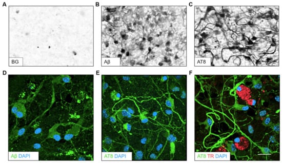 The following antibodies were utilized to detect tau and Aβ immunoreactivity: Tau5 (1:250, Invitrogen, Thermo Fisher Scientific, Vienna, Austria, AHB0042), Aβ antibody clone 6E10 (1:1000, BioLegend, Vienna, Austria, 803015) and PHF-Tau monoclonal antibody/AT8 (1:250, Thermo Fisher Scientific, Vienna, Austria, MN1020). These antibodies are characterized in additional experiments (see Supplementary Figure S1). Subsequently, the slices were washed with PBS and incubated with the appropriate conjugated biotinylated (diluted by 1:200) or fluorescent secondary antibodies (diluted by 1:400) in T-PBS- 0.2% BSA for 1 h at 20 °C while shaking. When using a biotinylated secondary antibody, the slices were rinsed 3× with PBS and incubated with avidin–biotin complex solution (Elite ABC-HRP Kit, Vector Laboratories, Newark, CA, USA, PK-6100) for 1 h at 20 °C. Finally, the slices were washed with 50 mM Tris-buffered saline (TBS) and then incubated in 0.5 mg/mL 3,3′-diaminobenzidine (DAB, Sigma Aldrich-Merck, Darmstadt, Germany, D7304)-TBS-0.003% H2O2 at 20 °C in the dark until a signal was detected. Upon the appearance of a DAB signal, the reaction was stopped by adding TBS. The slices were washed 3× in PBS and mounted with Mowiol onto gelatin-coated glass slides.