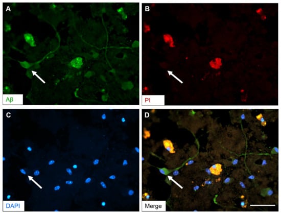 Figure 6. Amyloid-beta (Aβ) plaques develop intracellularly prior to cell death. Organotypic brain slices were produced from postnatal (day 8–10) wild-type mice and collagen hydrogels with human Aβ42 and P301S aggregated tau were applied. After 4 weeks of a culturing period, the media was supplemented with scopolamine, wortmannin, MHY1485, lead and cadmium (50, 10, 50, 100, 100 nM final concentration, respectively). The slices were cultured for another 4 weeks. Prior to fixation, the slices were incubated with 2 µg/mL propidium iodide for 30 min as a marker of cell death. Slices were fixed and processed by immunohistochemistry for Aβ+ immunoreactivity using the Aβ antibody clone 6E10. (A) A representative image of Aβ-specific positive fluorescent staining in the ventral parts of the slices (green; AlexaFluor-488). (B) Propidium iodide stained the dead cells in the same field (red). (C) Slices were counterstained for the nuclear dye DAPI (blue). (D) A merged image was generated, which reveals that the staining for dead cells colocalizes with the Aβ+ immunoreactivity. A viable healthy cell can be visualized nearby, as indicated by the white arrow in all panels. Scale bar in D = 50 µm in (AD).
