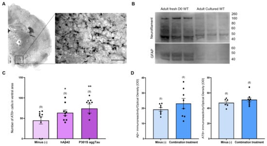 Figure 7. Culturing of adult slices from wild-type (WT) and transgenic (TG) animals. (A) Composite image of a half-brain adult slice shows AT8+ immunoreactivity after 9 weeks of culture with the magnified image showing representative AT8+ immunoreactivity in the ventral areas. (B) Acute fresh slices from 3 different adult WT animals (day 0) were collected and frozen immediately. Conversely, adult WT slices were cultured for 9 weeks and then compared via Western blotting. The acute slices display a strong signal for neurofilament and GFAP, whereas cultured slices show a severely reduced signal indicating the general decline of viability post-culture. (C) Adult slices from TG amyloid precursor protein _Swedish–Dutch–Iowa (APP_SDI) mice were incubated with collagen hydrogels containing human amyloid-beta 42 (hAβ42) or P301S aggregated tau (aggTau) for 9 weeks. A significantly increased number of AT8+ cells were quantified in the ventral areas between hAβ42- or P301S aggTau-loaded hydrogels and the empty hydrogels (minus group). The number of AT8+ cells were counted from the ventral regions and the values are reported as mean ± SEM. (D) Adult WT slices were supplemented with either scopolamine, wortmannin, MHY1485, lead and cadmium (50, 10, 50, 100, 100 nM final concentration, respectively) or normal media after 4 weeks of culture and then further cultured for 4 weeks. Slices were fixed and immunostained with the Aβ clone 6E10 or AT8 antibodies. No significant differences were found in the groups treated with the combination treatment and normal slice media. Images were quantified using ImageJ. Raw optical density measurements were inverted by correcting for slice background for each image such that 0 represents white and 255 represents black. Values are generated from an average of two images from left and right hemispheres per animal and values in parentheses indicate the number of analyzed animals. Statistical analyses were performed using a student’s t-test with equal variance, where p values < 0.05 represent significance versus the Minus (−) group (* p < 0.05, ** p < 0.01).
