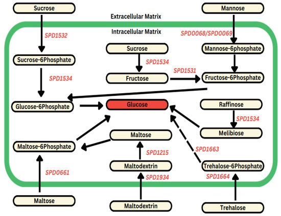 The repeat unit sugars in the Spn D39 capsule consist of one glucuronic acid molecule, two glucose molecules, and three rhamnose molecules [25]. Interestingly, both rhamnose and glucuronic acids share glucose as a key biosynthetic precursor, underscoring the paramount role of glucose as the primary and essential metabolite in Spn D39 capsule biosynthesis [26,27]. In this study, we observed the downregulation of various genes encoding the phosphotransferase system (PTS), responsible for importing different simple sugars from the extracellular matrix into the intracellular environment. These sugars can then be converted into glucose. Notable significant downregulated genes include SPD1532 (−2.5) (sucrose-specific PTS transporter subunit IIBC), SPD0068 (−1.8) (PTS system mannose/fructose/sorbose family transporter subunit IID), SPD0069 (−2.1) (PTS sugar transporter subunit IIA), SPD1664 (−3.5) (PTS system trehalose-specific EIIBC component), SPD0661 (−1.6) (PTS transporter subunit IIBC), and the oligosaccharide transporter SPD1934 (−1.5) (maltodextrin ABC transporter substrate-binding protein) (Figure 2). Additionally, the expression of several genes encoding proteins responsible for catalyzing the interconversion of various sugars into glucose is downregulated. Genes such as SPD1534 (−3.0) (sucrose-6-phosphate hydrolase), SPD1215 (−2.0) (alpha-amylase), SPD1531 (−2.1) (ROK family protein), and SPD1663 (−3.6) (alpha, alpha-phosphotrehalase) are among those showing reduced expression (Figure 2). The qRT-PCR results are consistent with RNA-seq data, as there was a significant reduction in the expression of SPD1663 (−5.2-fold) and SPD1664 (−3.7-fold).
