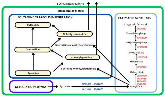 Genes associated with acetyl-CoA utilization in fatty acid synthesis, including SPD0382 (−7.1), SPD0383 (−6.8), SPD0384 (−5.5), SPD0385 (−4.3), SPD0386 (−4.1), SPD0387 (−4.6), SPD0388 (−4.3), SPD0389 (−4.1), and SPD0390 (−4.0), were downregulated (Figure 6). In contrast, an upregulation is observed in SPD1025 (2.4), SPD1026 (1.9), SPD1027 (2.1), and SPD1028 (1.7), encoding dihydrolipoyl dehydrogenase, dihydrolipoamide acetyltransferase, alpha-ketoacid dehydrogenase subunit beta, and thiamine pyrophosphate-dependent dehydrogenase E1 component subunit alpha, facilitating the conversion of pyruvate to acetyl-CoA. An alternative pathway for the use of acetyl-CoA involves its activation of spermidine/spermine N-acetyltransferase, catalyzing the formation of acetylated spermidine and spermine. This process regulates intracellular polyamine levels by facilitating the export of excess polyamines in their acetylated forms from the cell.