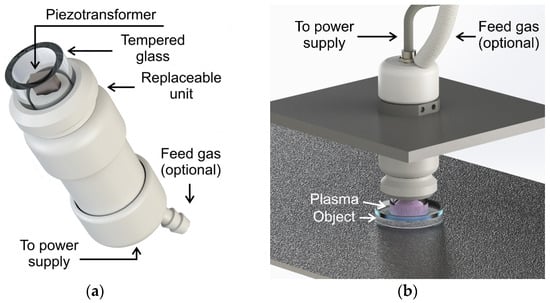 One of the interesting and promising types of direct treatment is processing using direct piezoelectric discharge (PDD) plasma [,]. Plasma sources using PDD are primarily characterized by energy efficiency, compactness, and flexibility in the design of the working (output) device [], which directly acts as a high-voltage electrode that creates plasma. The use of such plasma sources has already proven itself in medicine, where targeted effects are required, for example, on a tumor (cancer cells).