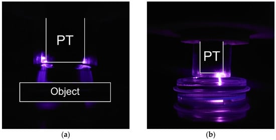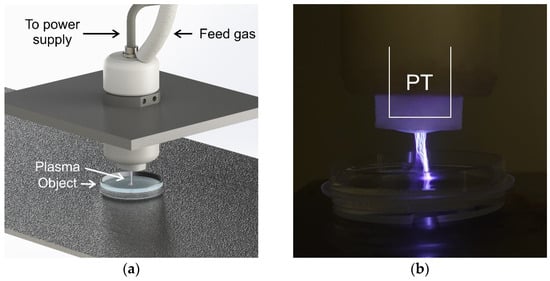 (a) Treatment setup in the argon plasma jet mode and (b) argon plasma jet photo. PT—piezotransformer.