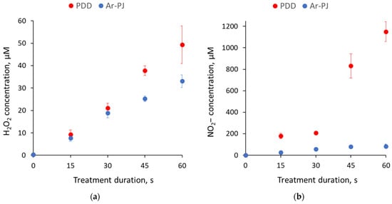 H2O2 and NO2− concentrations in 1 mL of PBS treated with PDD and Ar-PJ are presented in Figure 4. In both modes, the dependence on the treatment duration is close to linear. PDD, as expected, has better efficiency in terms of ROS and RNS generation. H2O2 concentration increased to 49 ± 8 μM in PDD mode and 33 ± 3 μM in Ar-PJ mode. NO2− concentration in PDD mode reached 1150 ± 92 μM, while NO3− concentration was at the level of ~2000 μM. Ar-PJ treatment shows significantly lower RNS generation, which is limited by nitrogen dissolved in the liquid and its weak diffusion into the discharge region from the ambient air.