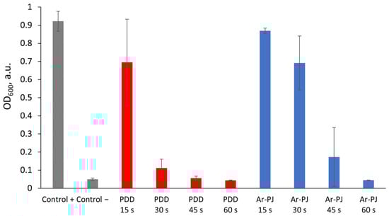 Optical density (OD600) of cell suspension in various modes of plasma treatment. PDD—piezoelectric direct discharge; Ar-PJ—argon plasma jet. Results are presented as mean and standard error.