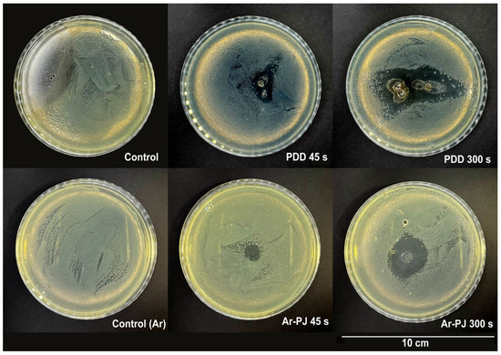 We also studied the direct effect of the considered types of plasma treatment on bacterial cells on agar. This made it possible to determine the area of effective plasma action in each mode. The treatment duration was chosen to be the shortest of those that showed good efficiency—45 s. Treatment was also carried out for 500 s to monitor the dynamics of the increase in the area of bacterial inhibition and possible areas of damage to the heat-sensitive surface. The data obtained indicate the presence of an inhibitory effect with 45 s of treatment with both PDD and Ar-PJ (Figure 6). The average % inhibition area was 18 and 24 for PDD and Ar-PJ treatment for 45 s, % inhibition area was 5.2 ± 0.25% and 1.45 ± 0.08% for PDD and Ar-PJ, respectively. Prolonged exposure for 300 s also had a pronounced inhibitory effect. The proportion of the inhibition region was 22.8 ± 1.15% and 9.7 ± 0.44% for PDD and Ar-PJ, respectively.