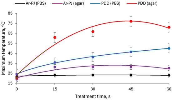 The time dependence of the local maximum temperature on the surface of the sample during processing is presented in Figure 7. In the case of processing contaminated PBS, the maximum local surface temperature (hot spot) practically does not increase when processing in the Ar-PJ mode. In PDD mode, it can reach 50 degrees at the point of contact of the discharge with the surface, but the temperature near this point is much lower.