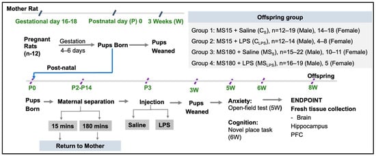 Pups were born (P0) 4–6 days after arrival of pregnant rats. From P2–14, pups were separated from their mothers for either 15 min or 180 min. On P3, saline/LPS (i.p.) was injected into the pups. At P20, pups were weaned. The groups after MS and LPS injection were designated as CS, CLPS, MSS, and MSLPS. One week after weaning, mothers were euthanised. Behavioural testing was performed on offspring from 5 to 6 weeks of age. At the age of 8 weeks, rats were euthanised and fresh tissues collected and snap frozen (Figure 1).