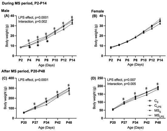 In the current study, a main effect of MS was not observed, although the analysis of interaction between two stressors (MS and LPS) suggested that MS reduced body weight in males during earlier age (P2–14) and after weaning in females (P20–48). There was no additive detrimental effect on body weight when the two stressors were combined (LPS and MS) in either male or female rats. Some authors have reported MS (P2–14, 3 h/day) leads to reduced body weight in both male and female offspring early in life, i.e., until 3 weeks of age [62,63,64]. The reduction in body weight may be explained by the fact that separation from mothers can affect the mother–offspring interaction, leading to inadequate nutrition [65]. Others have proposed that reduced growth hormone in pups resulted in lower body weight and abnormal growth trajectory [66,67,68], similar to our finding where 3 h of MS reduced body weight in offspring until early adulthood.