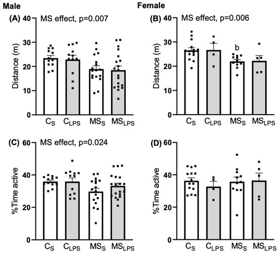 In male rats, a main effect of MS was observed in the distance travelled (F(1,56) = 7.892, p = 0.007, Figure 4A), and percentage time active (F(1,56) = 5.344, p = 0.024, Figure 4C) on the locomotor activity of the rat offspring. Thus, control offspring covered more distance and were more active than MS offspring. In female rats, an MS effect was observed in distance travelled (F(1,30) = 8.506, p = 0.007, Figure 4B) while no effect of MS and LPS was observed in percentage time spent active (Figure 4D). Control female offspring covered more distance than MS offspring. Further, Tukey’s post hoc analysis revealed a significant difference between CS and MSS in distance travelled (p = 0.036) and mean speed (p = 0.036).