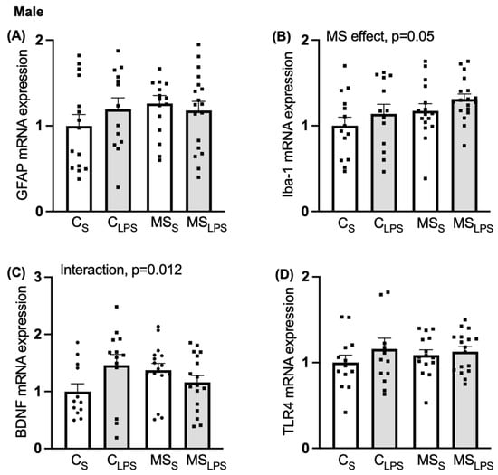 Relative gene expression in the hippocampus in male offspring. Data are shown as mean ± SEM (n = 10–18 per group) and assessed by two-way ANOVA followed by Tukey’s post hoc. Relative gene expression of (A) GFAP, (B) Iba-1, overall MS effect, p = 0.05, (C) BDNF, interaction between MS and LPS, p = 0.012, and (D) TLR4.