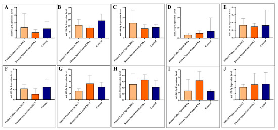Figure 9B) are presented with mean bars and SD. Additionally, the control RNA from human sperm and the reverse miR499a-5p group are different from the control group and the total RNA from the sperm of the patient’s father.