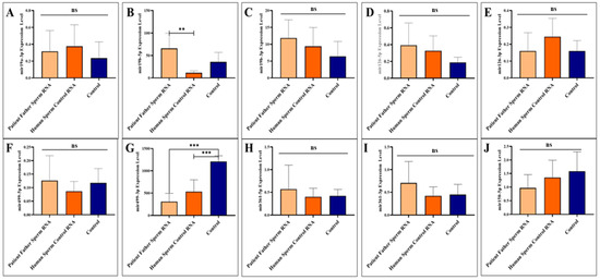 Sperm samples were collected during adult sacrifice. Analysis of miRNAs expression levels in mouse sperm, A to J (miR-19a-3p, miR-19b-5p, miR-19b-3p, miR-126-5p, miR-126-3p, miR-499a-5p, miR-499a-3p, miR-361-5p, miR-361-3p, and miR-150-5p, respectively) was performed. Mice received RNA from the patient’s father’s sperm and/or RNA from healthy sperm via microinjection.