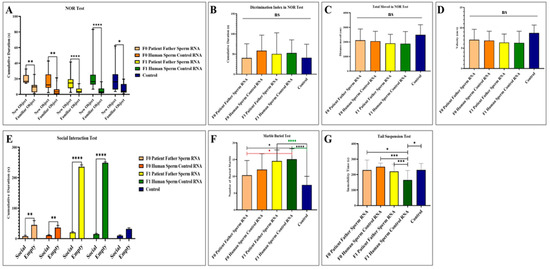 Figure 3). While it was observed that the interest in the new object was higher in all groups in the novel object recognition test, no significant difference was detected between the groups in terms of discrimination index, total movement, and speed. In the social interaction test, all groups, except the control group, including the F0 and F1 generations, showed more interest in the empty cage and exhibited behaviors that did not support social life and lacked empathy. In the marble test, there is an increased marble burying activity towards the next generation compared to the control, which is an indicator of hippocampal damage. This situation is clearly observed in the mouse group born after the microinjection of RNA from the sperm of the patient’s father. In the tail suspension test, where anxiety findings were measured, it was determined that although the most inactive group was the F1 born from the human sperm RNA control group, all groups exhibited similar phenotype behavior to the control.
