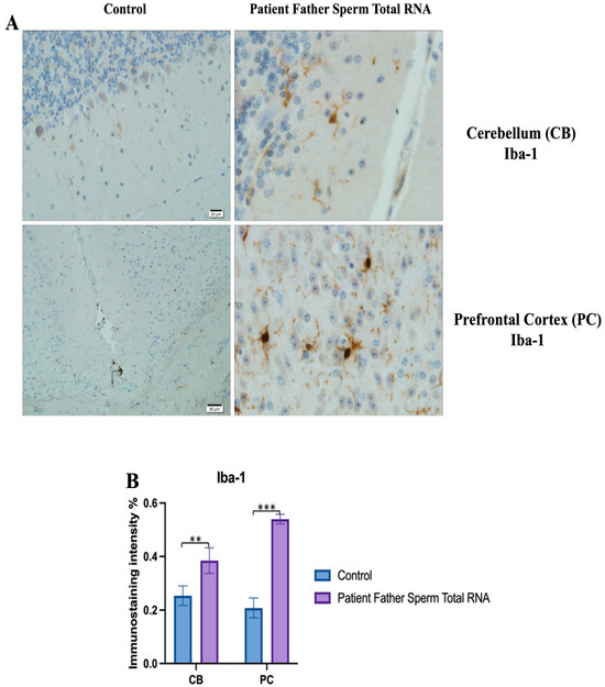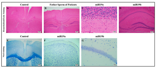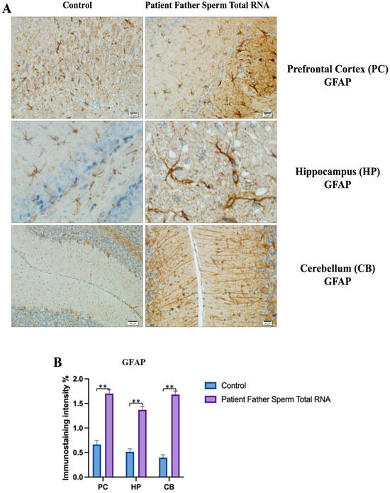 At the cellular level, neurodegeneration was not observed in the prefrontal cortex, striatum, hippocampus, and cerebellum regions of animal brains in all groups, but gliosis was observed in the VPA, human sperm RNA, and reverse miRNA groups (