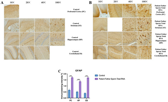 We conducted GFAP immunostaining on samples from the prefrontal cortex, striatum, hippocampus, and cerebellum. In