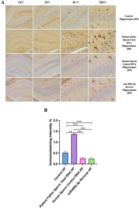 Microglia cells and astrocytes are known to play an important role in regulating neuronal metabolism, providing nutritional support to neurons, shaping, facilitating synapse formation, and contributing to neurotransmission. Furthermore, in the mouse group born from mice microinjected with RNA from human sperm (from both the father of autistic children and the normal group), the number of oligodendrocyte products was increased and significantly branched compared to the control and VPA groups. So, at this point, these results reveal an additional side effect of human sperm RNAs rather than just autism. Unlike the miRs previously examined, miR-499b-3p also induced the same changes as observed in sperm total RNAs and VPA groups in astrocytes and microglia, although miR-19a and miR-499b-5p did not produce the same effects.