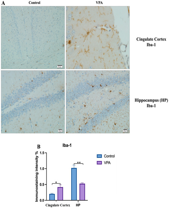 19]. Our study involved, the examination of the brain anatomy in animals from all groups, utilizing immunohistochemical stains. Notably, differences were observed in animals induced by valproic acid (VPA) and microinjected RNA. While astrocytes showed abnormal astrogliosis (and microgliosis, which is normally invaded by microglia), no signs of astrocyte disorientation or microglial extensions, which are often seen in the autistic human brain, were detected. Moreover, we did not observe an increase in size (hypertrophy) in GFAP and Iba-1-positive cells, nor observe an increase in the number of immunopositive cells (hyperplasia).