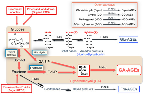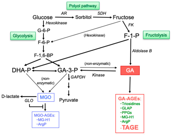 GA is a very potent glycating agent that is produced by the pathways responsible for sugar metabolism, including fructolysis, glycolysis, and the polyol pathway [38], and plays an important role in the generation of GA-AGEs (Figure 2).