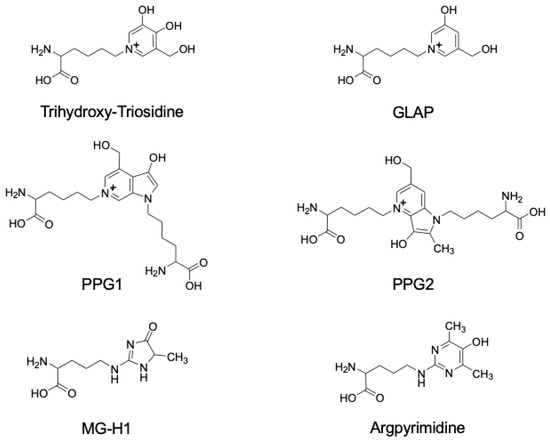 Tessier et al. incubated GA with Nα-acetyl-L-Lys and Nα-acetyl-L-Arg and isolated four new Maillard reaction pyridinium compounds named triosidines [41]. Lys adducts are trihydroxy-triosidine, Lys-hydroxy-triosidine, and triosidine-carbaldehyde, the latter of which is labile. The Lys-Arg adduct is Arg-hydroxy-triosidine. Triosidines are a novel class of AGEs that are expected to offer novel insights of biomedical importance for disorders of triose metabolism and the biophysical and toxic effects of triose-based diseases.