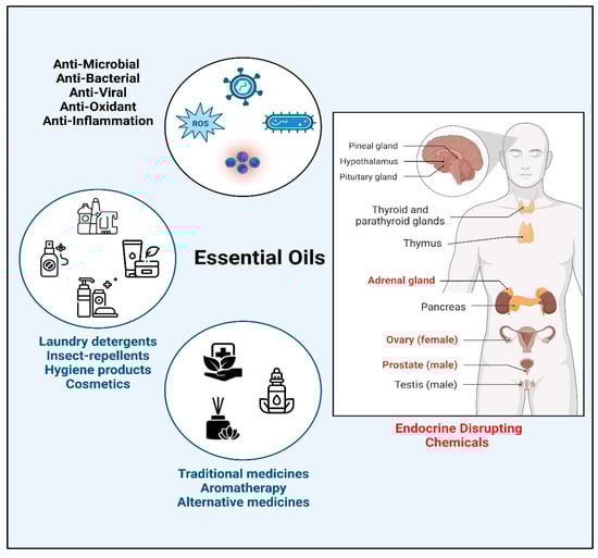 Essential oils are a complex mixture of volatile compounds extracted from aromatic plant tissues with a characteristic “essence” or smell []. Pure extracts of essential oils are obtained through different methods such as steam distillation, solvent extraction, and hydro distillation []. The chemical composition of essential oils can vary depending on the origin and species of the plant, climate, and extraction method []. Two major constituents of essential oils are terpenes and terpenoids []; some examples of terpenes found in essential oils are cineol (Eucalyptol), linalool, pinene, limonene, thujene, bisabolene, caryophyllene, p-cymene, camphor, neral, menthol, and geraniol, while aromatic compounds consist of carvacrol, thymol, cinnamaldehyde, eugenol, and estragole []. Owing to their fragrance, essential oils are extensively used in many cosmetic and hygiene products [,]. Due to their anti-microbial, antibiotic, antiviral, antioxidant, and anti-inflammatory properties, essential oils have been part of traditional therapies and herbal medicines for a long time [,,] (Figure 1). Being “natural” in origin, essential oils are often considered as safer substitutes of chemical drugs that may have adverse side effects []. However, in addition to their therapeutic role, essential oils might function as potential endocrine-disrupting chemicals (EDCs).
